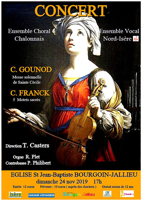 - Deux ensembles vocaux : L’Ensemble Vocal Nord Isère (EVNI de l’ Association A Cœur Joie) et l’Ensemble Choral Chalonnais (ECC) sous la direction de Thibaut CASTERS, vous proposent, (à deux jours de la Ste Cécile - patronne des musiciens) des œuvres sacrées pour chœur, orgue et solistes. La Messe solennelle de Sainte Cécile de Charles GOUNOD (Œuvre la plus connue en dehors de ses opéras), Cinq motets sacrés de César FRANCK, l’Ave Verum de Camille SAINT SAËNS