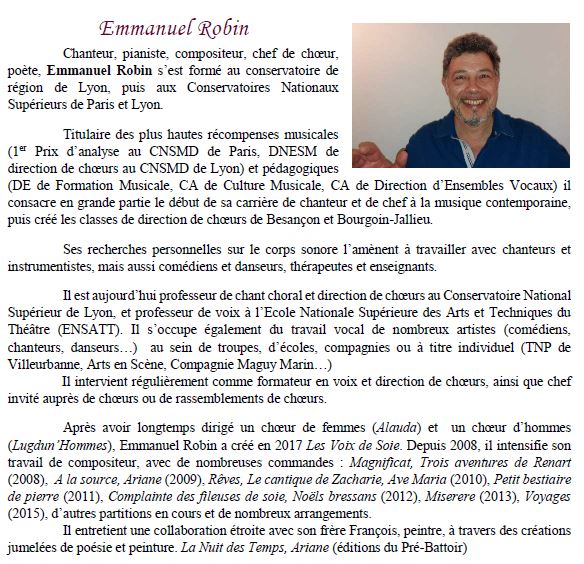 Venez en savourer les réécritures d’Emmanuel Robin, à 3 ou 4 voix, et partageons
